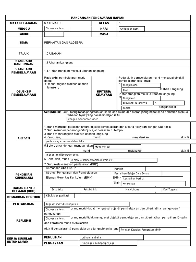 . Tingkatan 5 3 Nota Ringkas Penafian. RPH Matematik Tahun 5 Lengkap adalah Rancangan Pengajaran Harian yang perlu disediakan lebih awal oleh guru sebelum menjalankan sesi pegajaran dan pembelajaranRancangan Pengajaran Harian ini dibina sebagai panduan para guru untuk mengajar dengan lebih sistematik dan efektif serta mampu untuk mencapai apa yang. RPH BM RPH PKJR RPH Pendidikan Sivik.